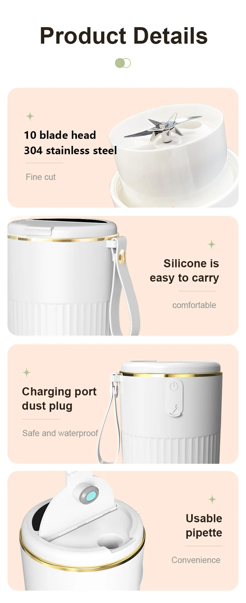 1. Powerful Blending Performance: Equipped with 14 sharp blades and a high-speed motor, this portable juicer delivers powerful blending capabilities. It quickly processes fruits into smooth juice, ensuring you enjoy fresh, homemade beverages with minimal effort.