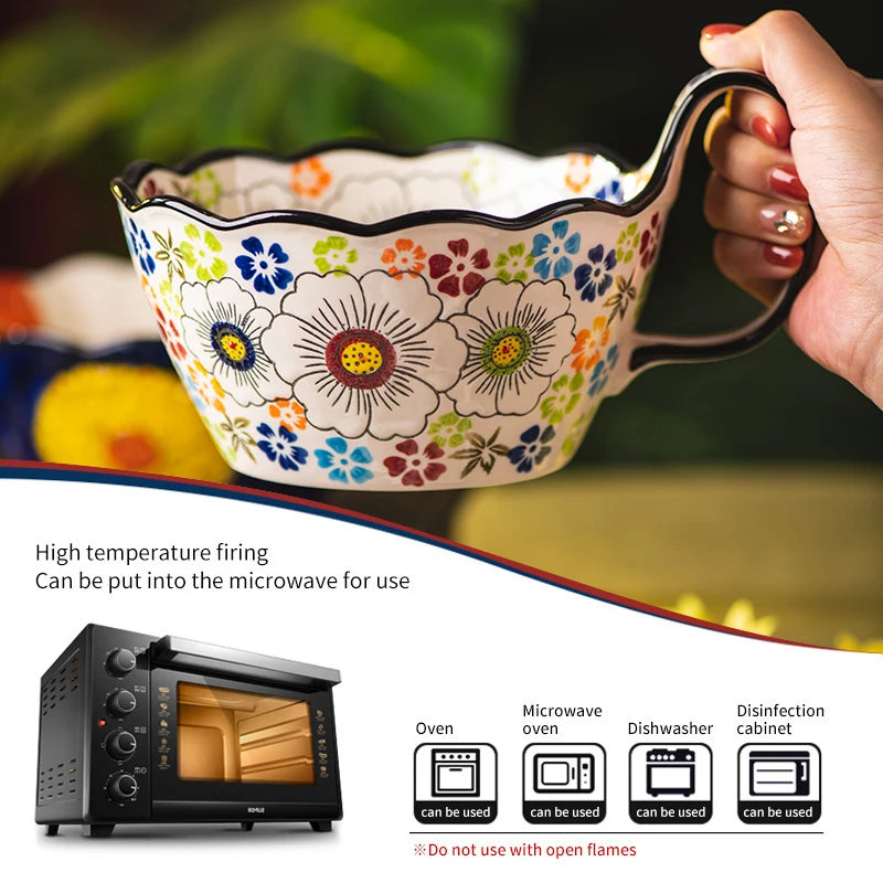 Bring the beauty of this Japanese style floral craftsmanship to your table with this hand-painted ceramic handle bowl, this bowl is perfect for both everyday meals and special occasions. With a generous 1L capacity, it’s versatile enough for instant noodles, hearty soups, fresh salads, or even baking dishes straight from the oven.